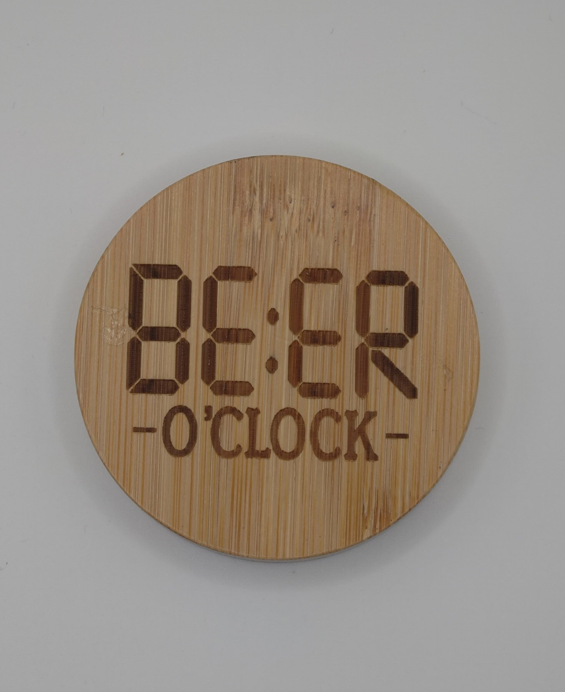 Natural bamboo magnetic bottle opener with "Beer O Clock" engraving .